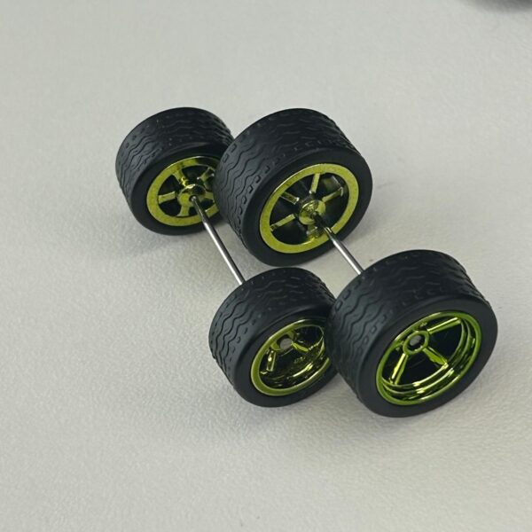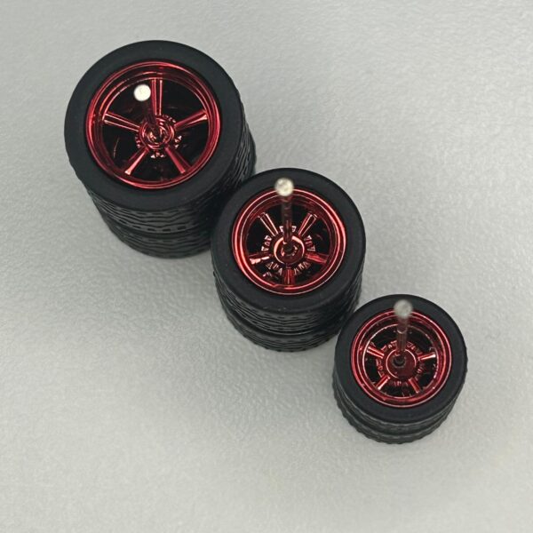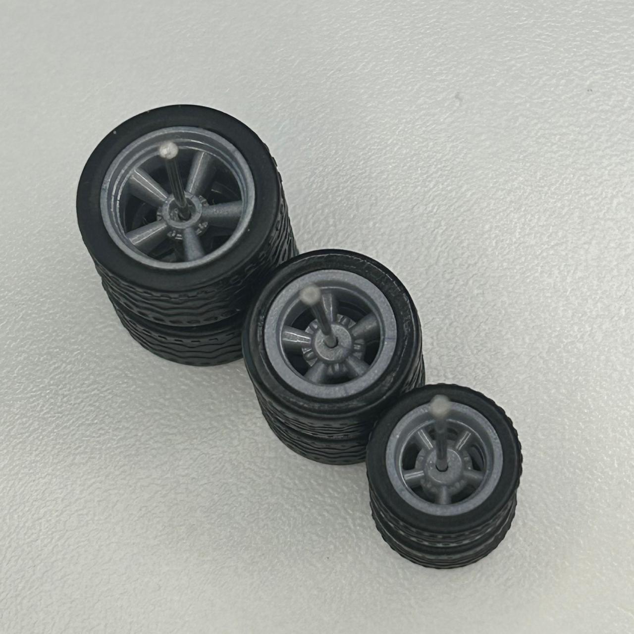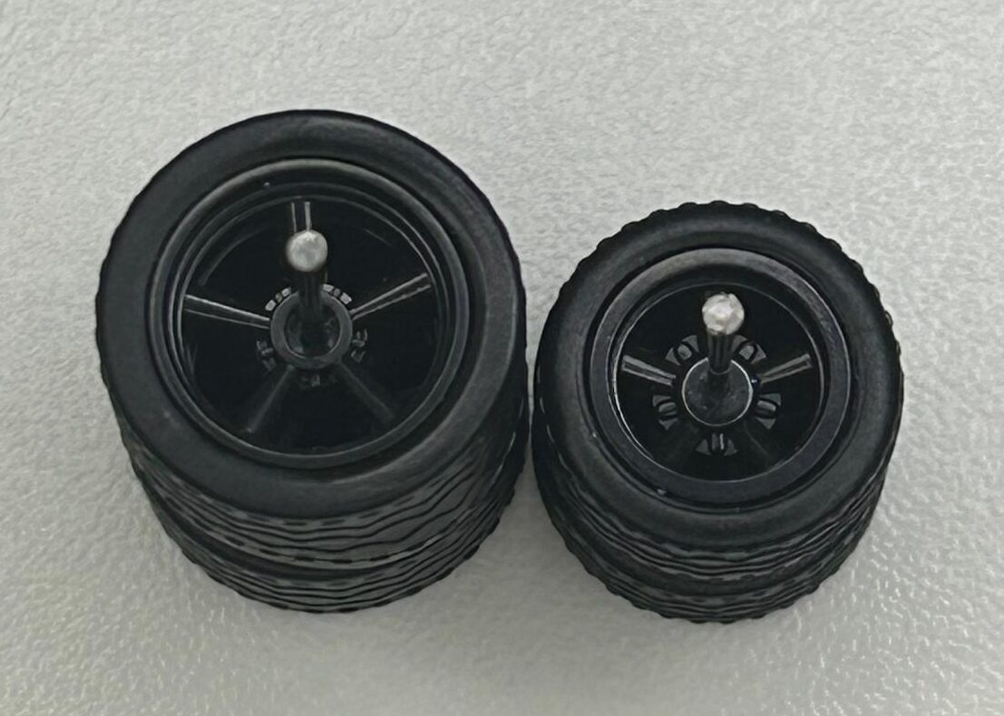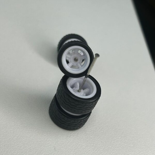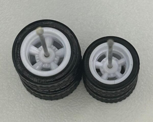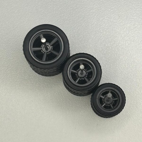 Kit/ composição: 4 rodas pneus e dois eixos em medidas padrão. Essas medidas são fixas e podem não ser totalmente compatíveis com todas as miniaturas.